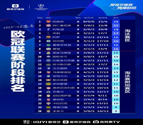 阿森纳8战全胜以联赛阶段第一晋级16强,利物浦、热刺、切尔西、曼城均进入前八,纽卡第12名将参加淘汰赛附加赛。
