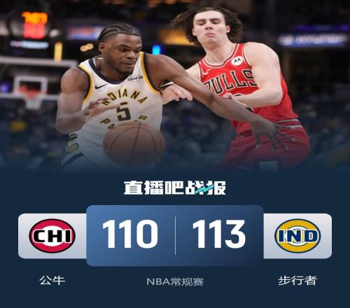 上半场,两队开场便陷入缠斗,比分始终紧咬,公牛三分4连击,沃克和和内史密斯相继飙中三分努力追赶,许尔特抛投将分差拉开到两位数,次节公牛命中率下降,步行者连中三分缩小分差,半场战罢公牛53-49领先步行者。下半场,两队依旧打得难解难分,公牛持续发力逐渐占据场上主动,末节双方围绕两位数的分差展开拉锯战,赫夫内外开花,步行者突然发力扳平比分,关键时刻科比·怀特绝杀失手,最终,步行者113-110逆转公牛。